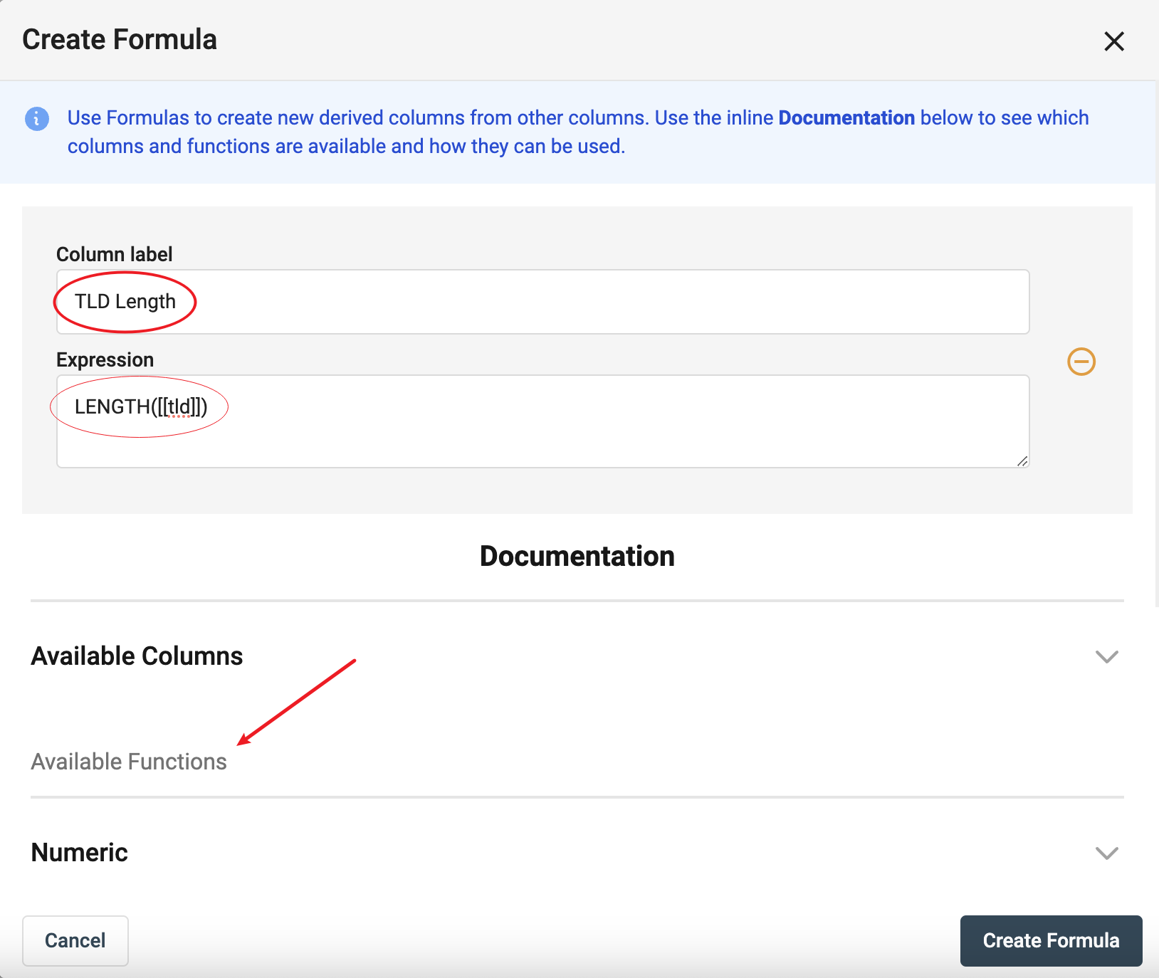 Here you can write your own formula to create a new column within your data. All available function are accessible below the expression box. You can also find additional documentation on writing formula's HERE.