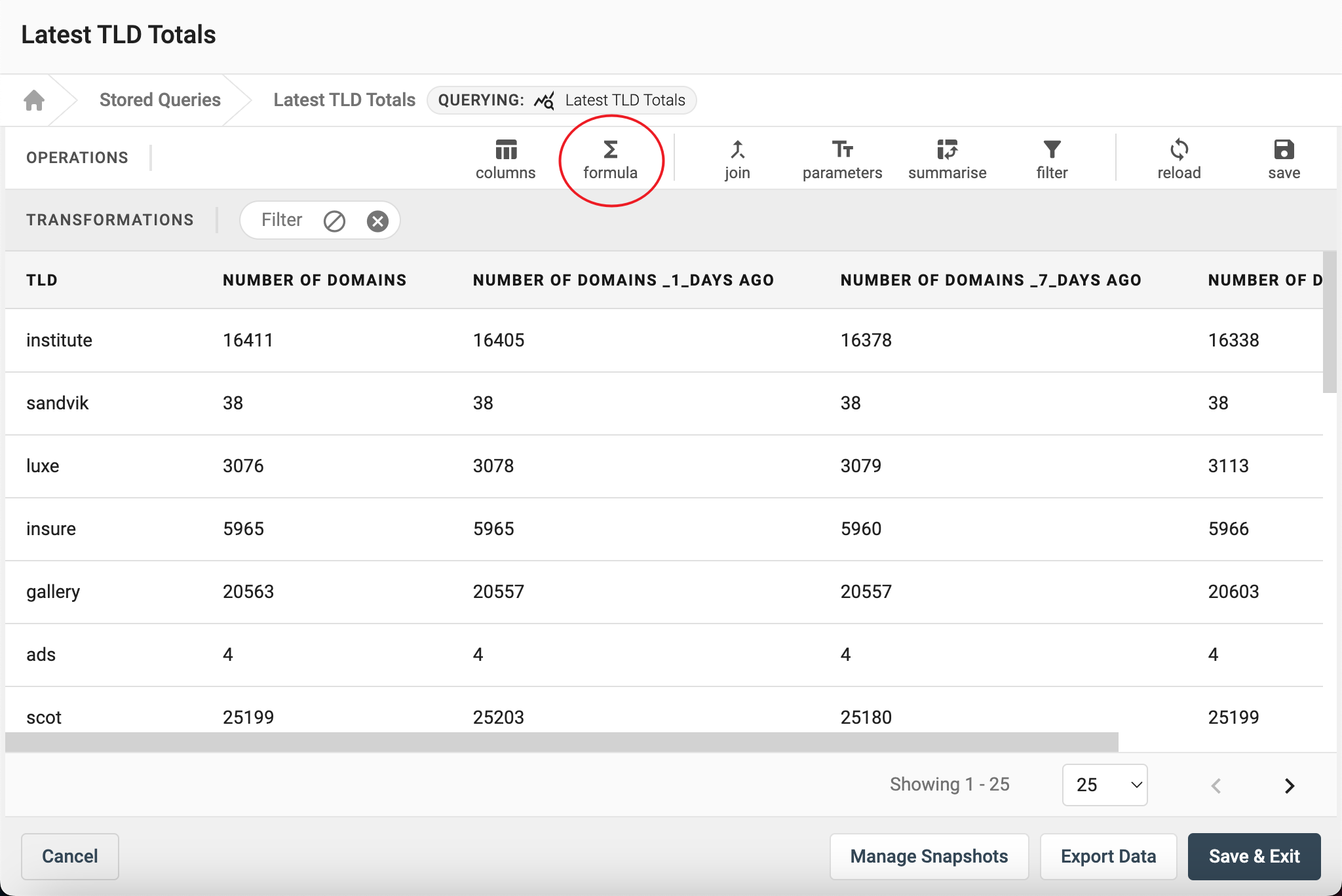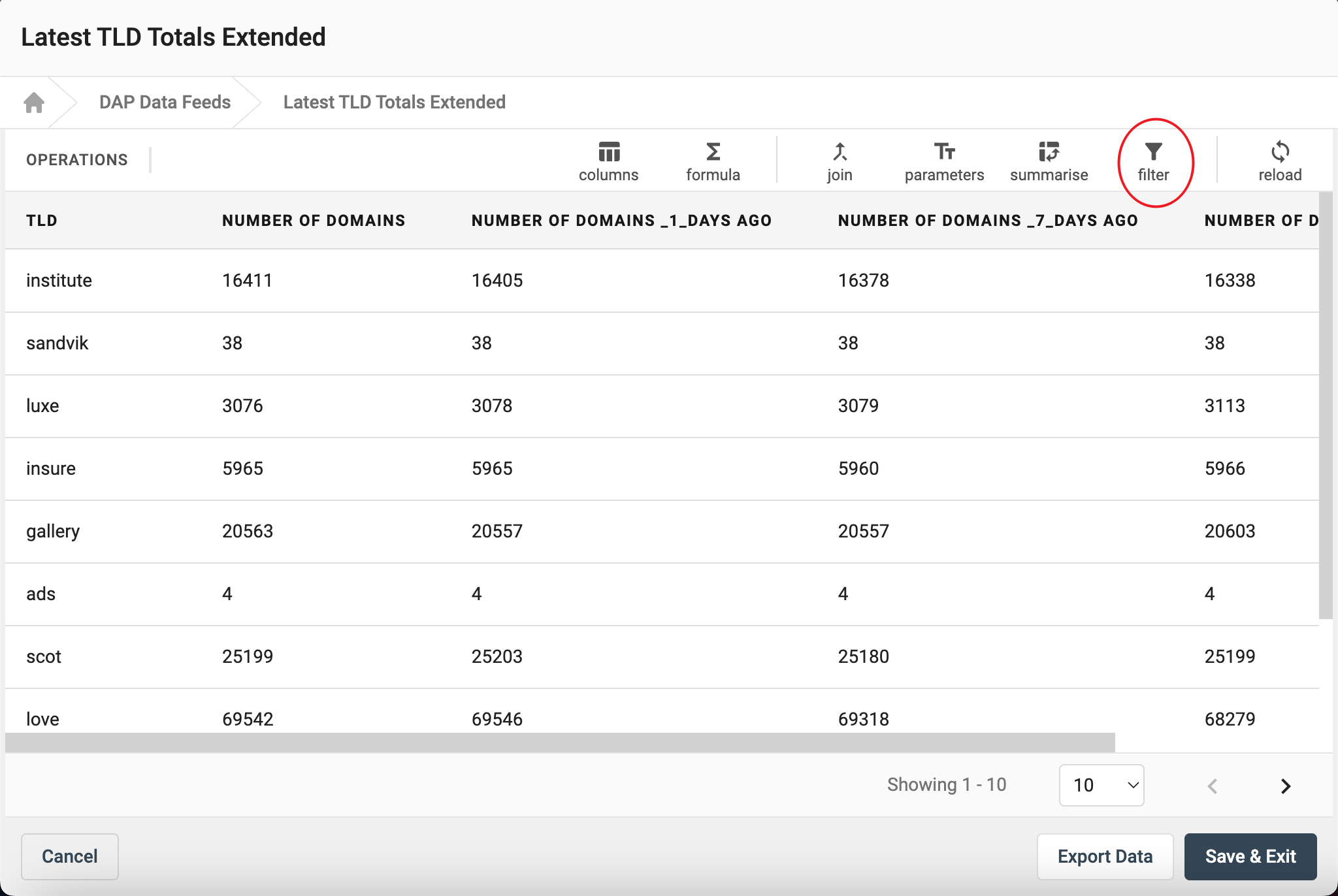 In this tutorial, the Latest TLD Totals data feed will be used as an example of how to query. To begin the analytics on this data, we will add a filter.