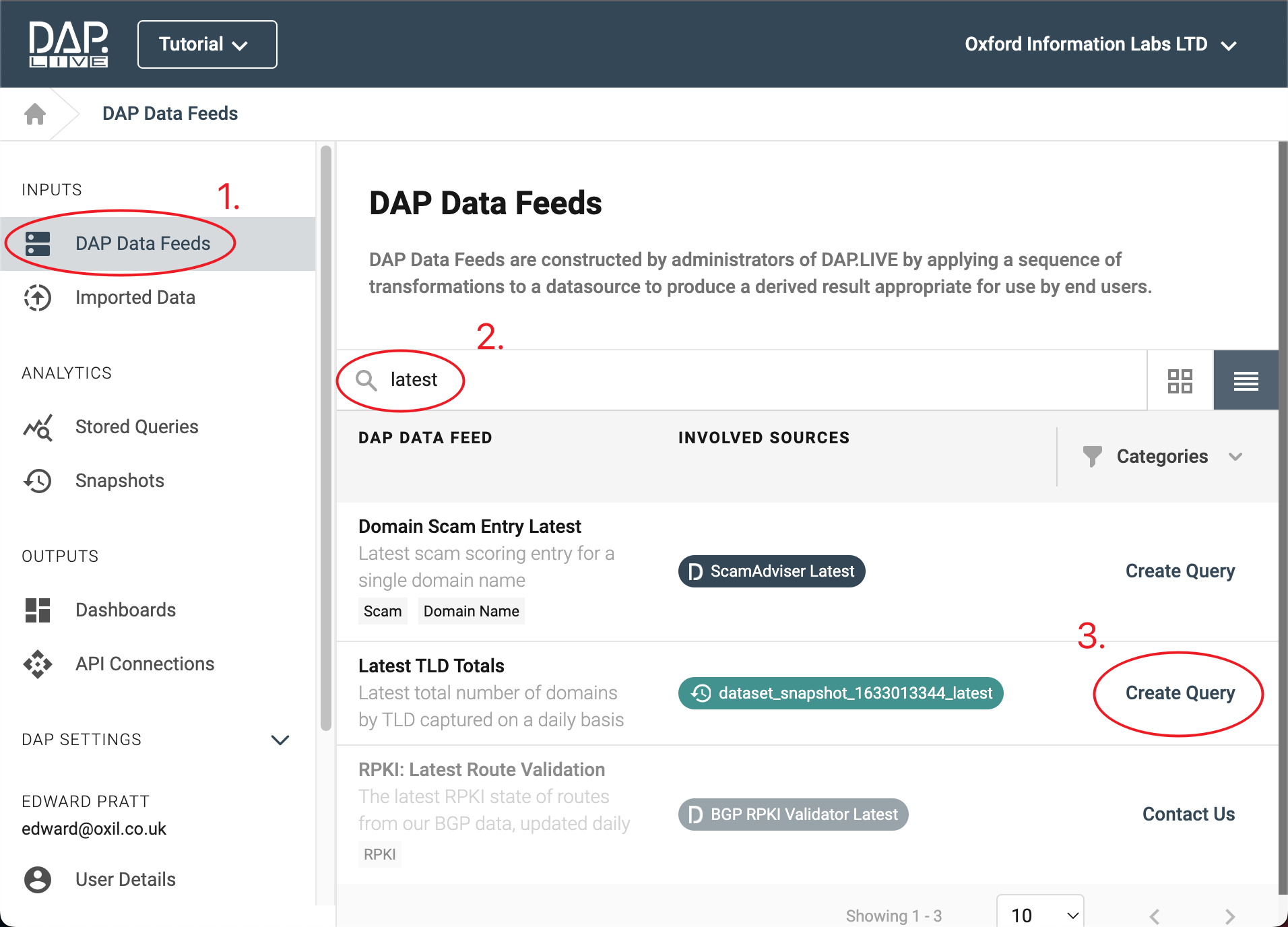 Once you are in your project, select 'DAP Data Feeds' (1), on the left-hand column, to access the data available to your account. Here you can search for specific data feeds (2) and create queries from each data feed (3).