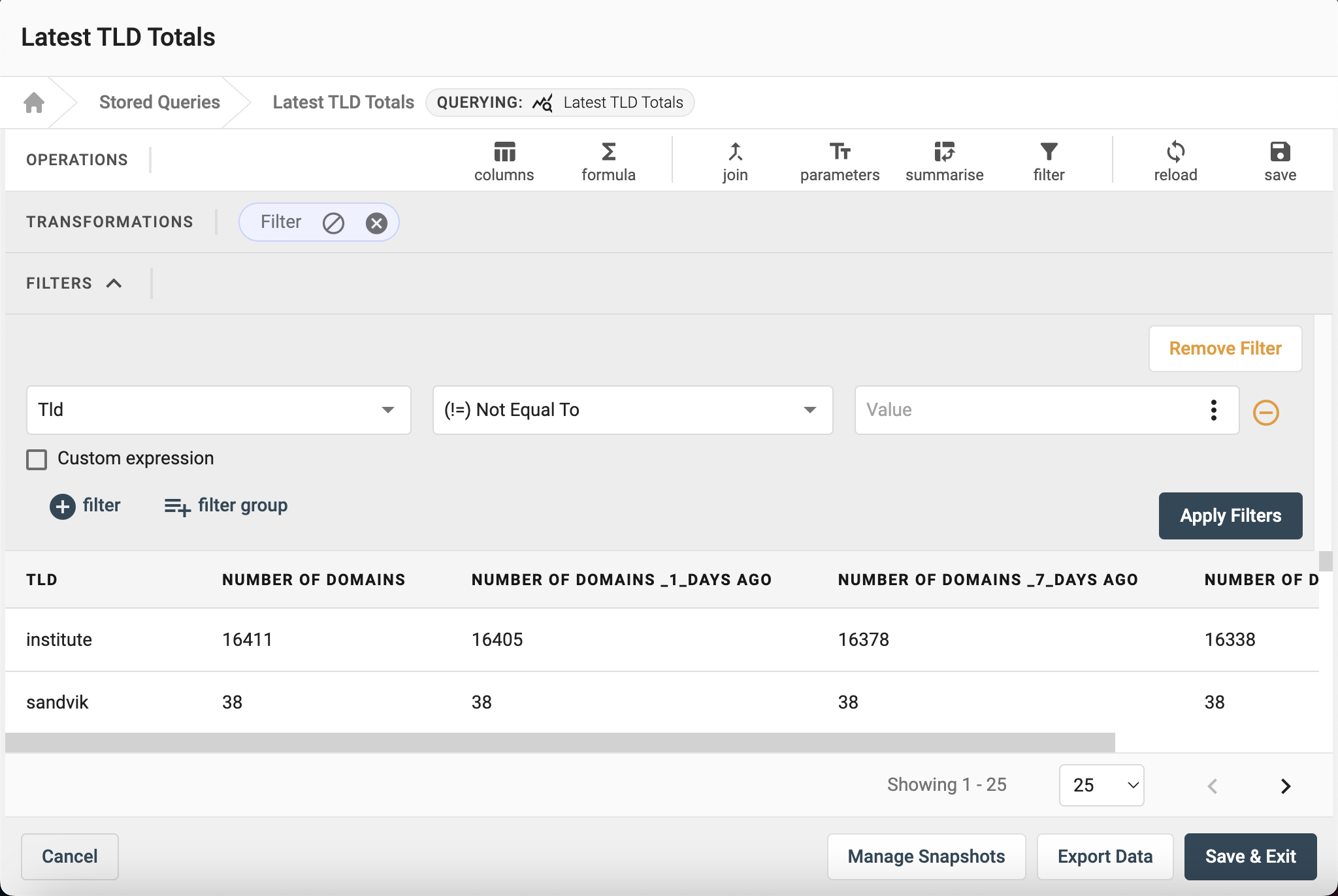 In this example, we will add a filter to remove any data without a TLD. You can do this by selecting 'TLD' - 'Not Equal To' - '', in the relevant boxes.
