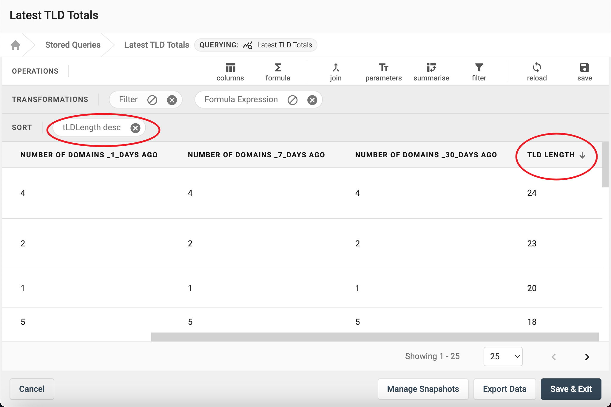 Once the formula is created you can sort the column in descending order by clicking the arrow next to the column title. This will allow you to see the longest TLDs first.