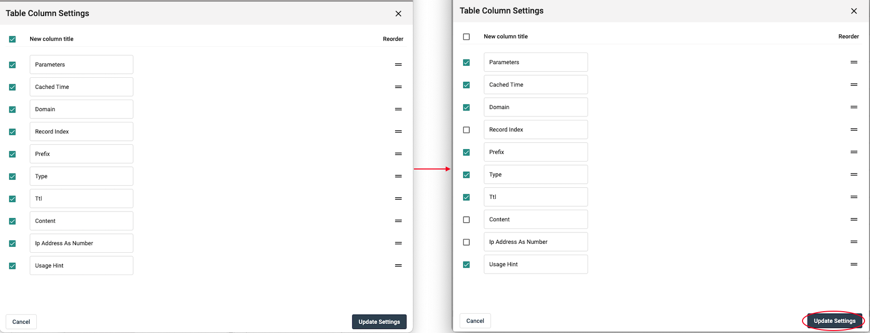 Column settings will appear and from there, you can select what columns you would like included in your query. Once you are happy with your selected columns, click 'Update Settings'.