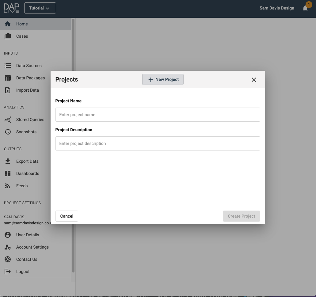 If you are an account administrator you will be able to create new projects using the new project button and filling in the fields as shown in the following screen where you will need to supply a name and description for the new project.