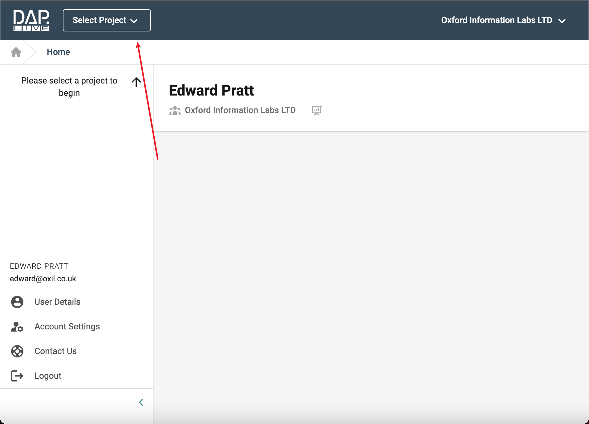 When first logging into DAP.LIVE on a new computer you will be required to choose a new project to work with from the following screen: