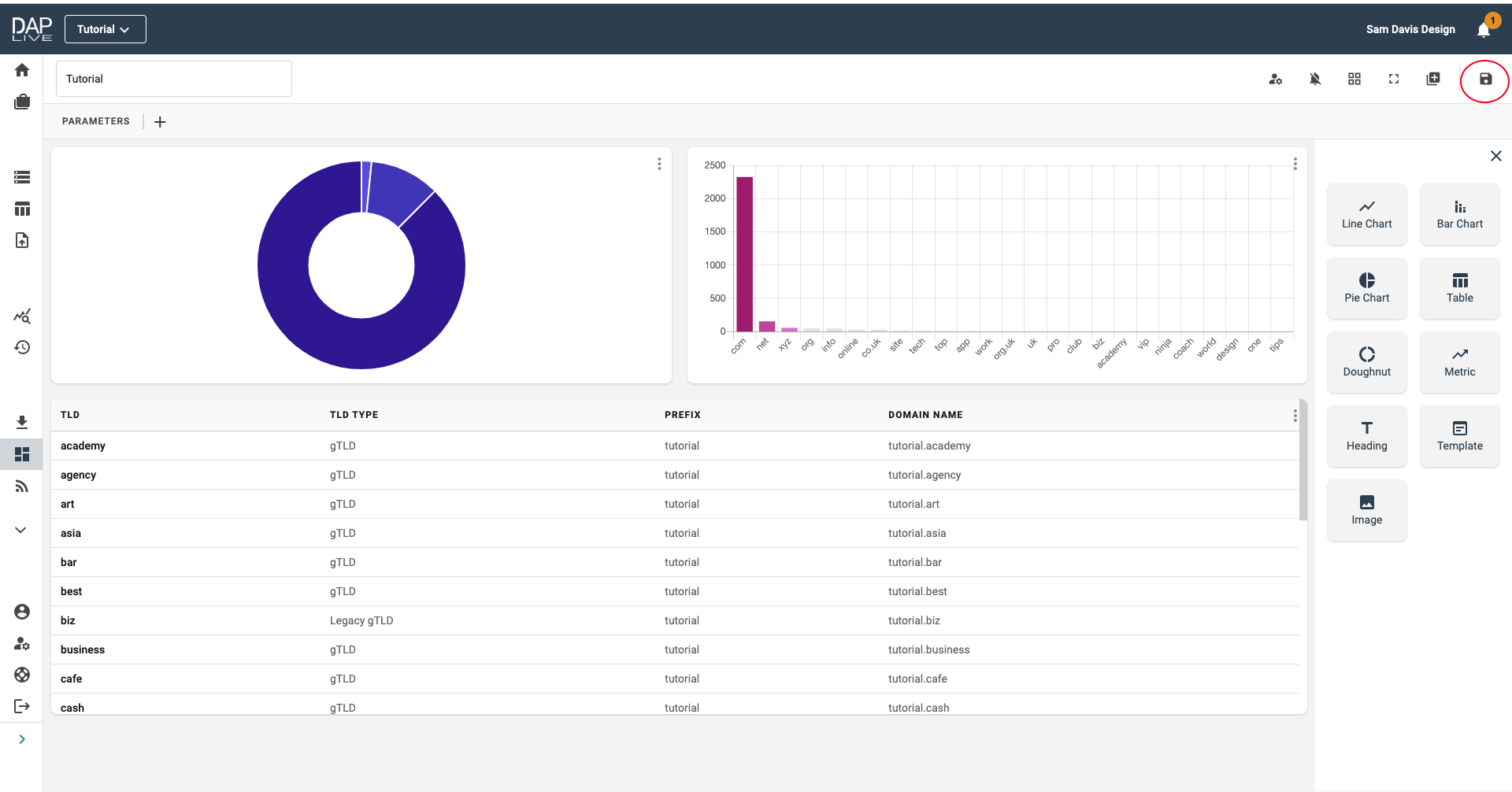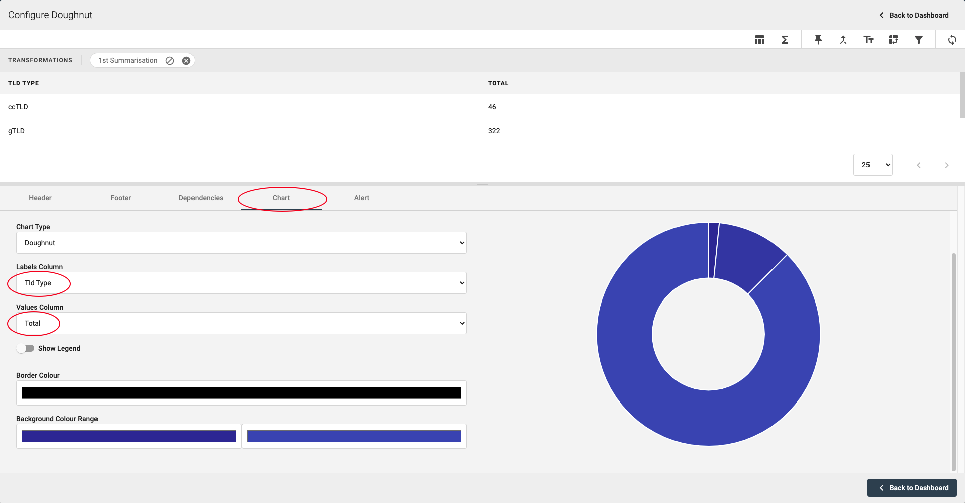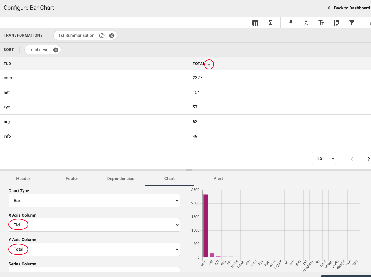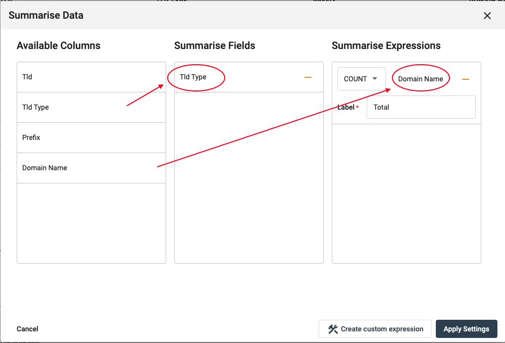 Additionally, you need to summarise the data. In this example we will summarise the Tld type by the total number of domain names.