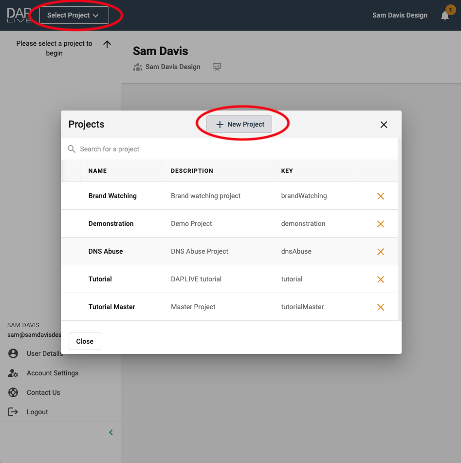 Create a new project by selecting 'Select Project' and '+ New Project'.