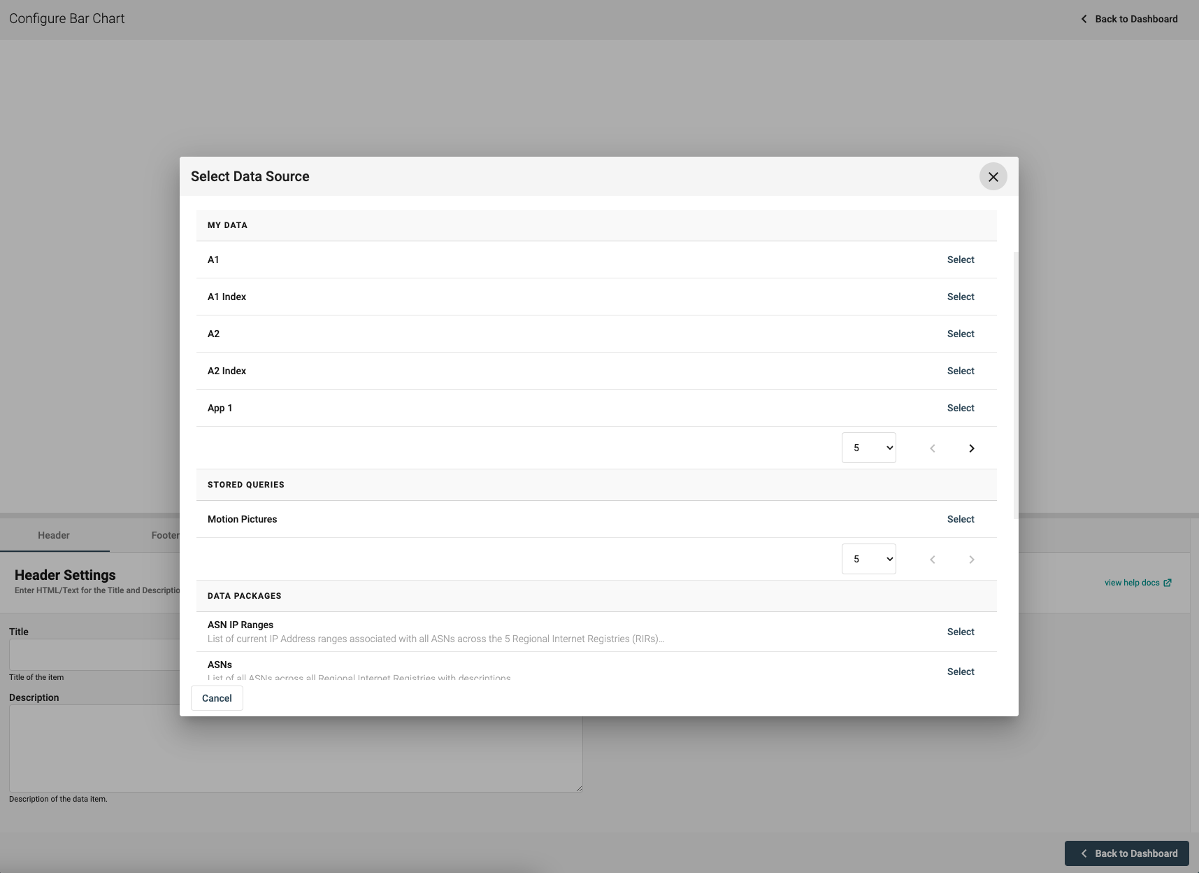 Select which data, stored query, data feed or snapshot you would like to create a Bar Chart from.