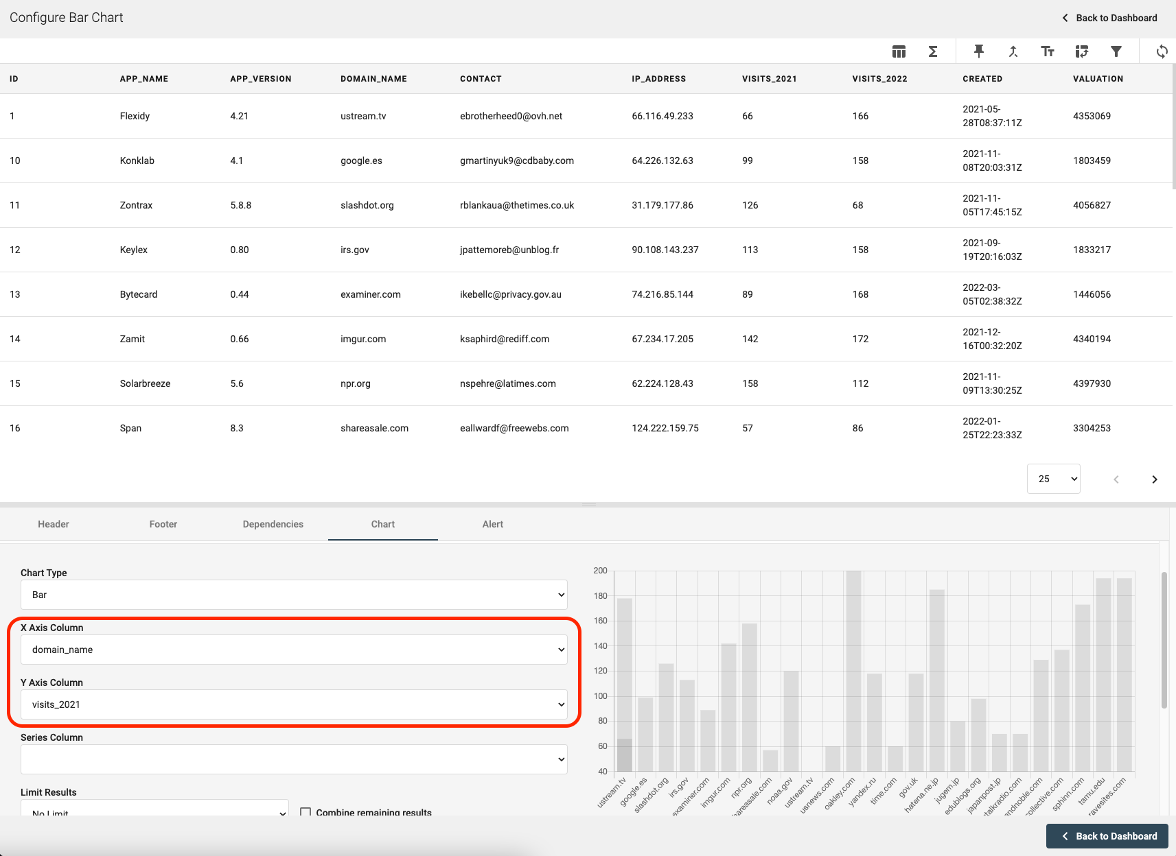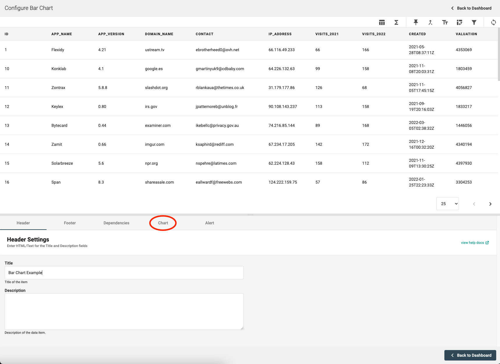 Name your Bar Chart under the 'Header' section and then click on the 'Charts' section. Here you will be able to select which columns of data you would like to set as your X and Y axes.