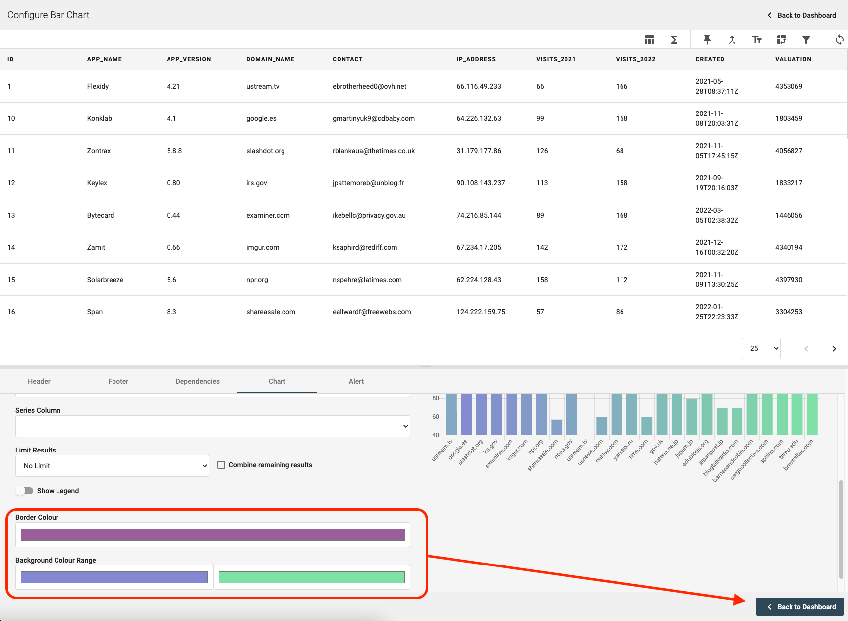 You can set various colours for your Bar Chart and a preview of what your chart will look like is shown on the right. Once you are happy with your Bar Chart, simply click 'Back to Dashboard' in the bottom right-hand corner.
