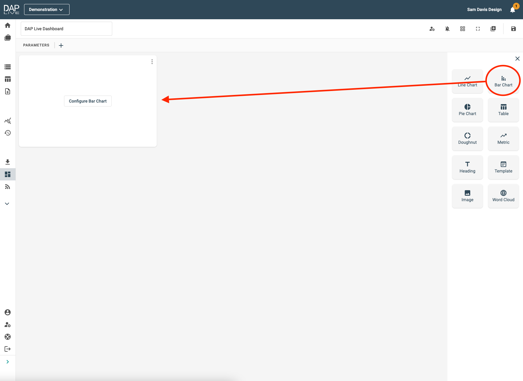 Give your dashboard a title and begin configuring by dragging and dropping the Bar Chart icon onto the screen. Then click 'Configure Bar Chart'.