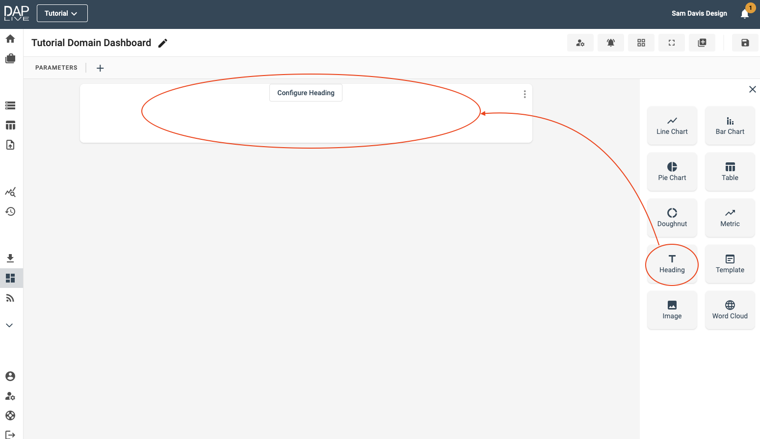 Give your dashboard a title and begin configuring by dragging and dropping the Heading icon onto the screen. Then click 'Configure Heading'.