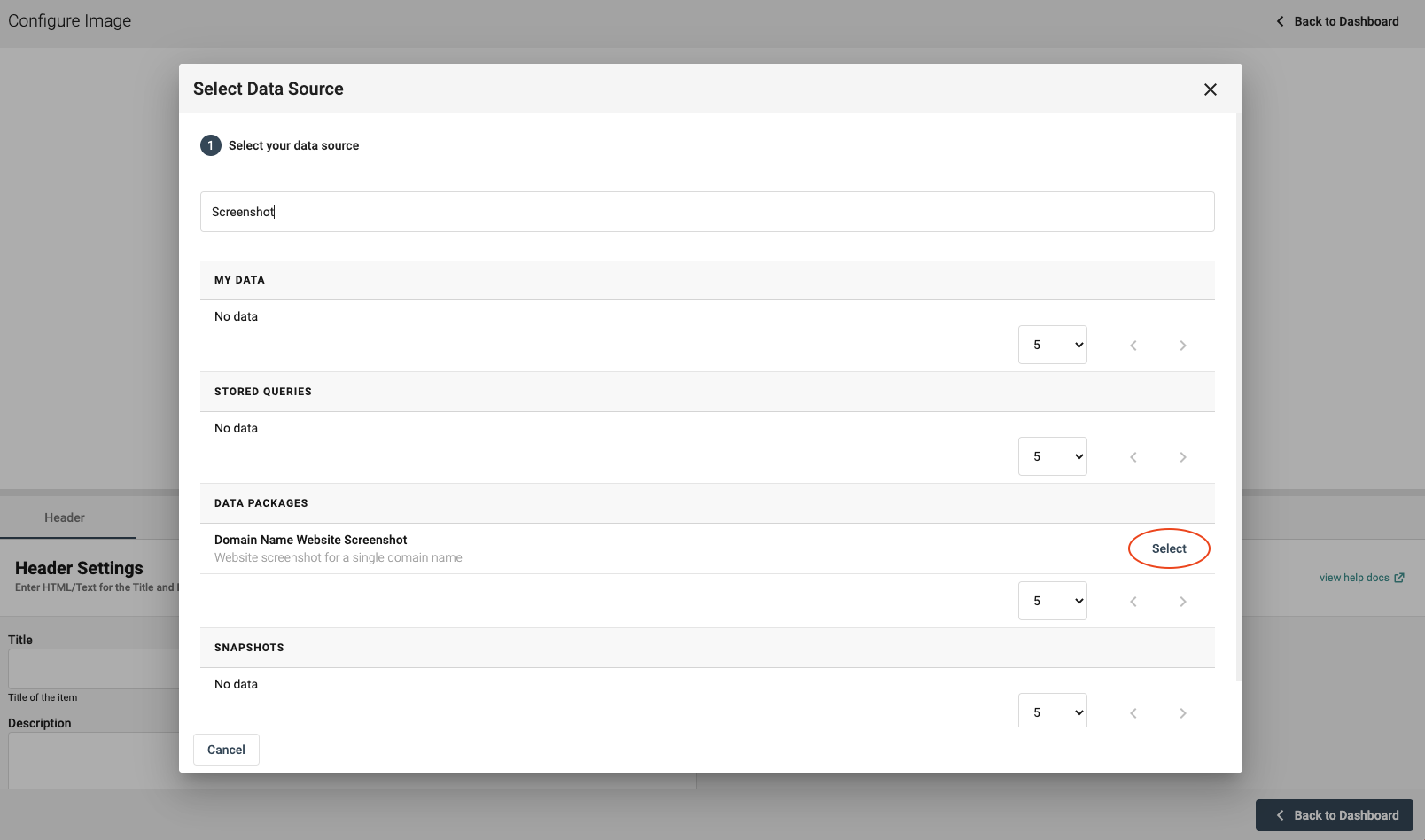 Select which data, stored query, data package or snapshot you would like to insert your Image from. Your Image should be stored in your data source in URL format.