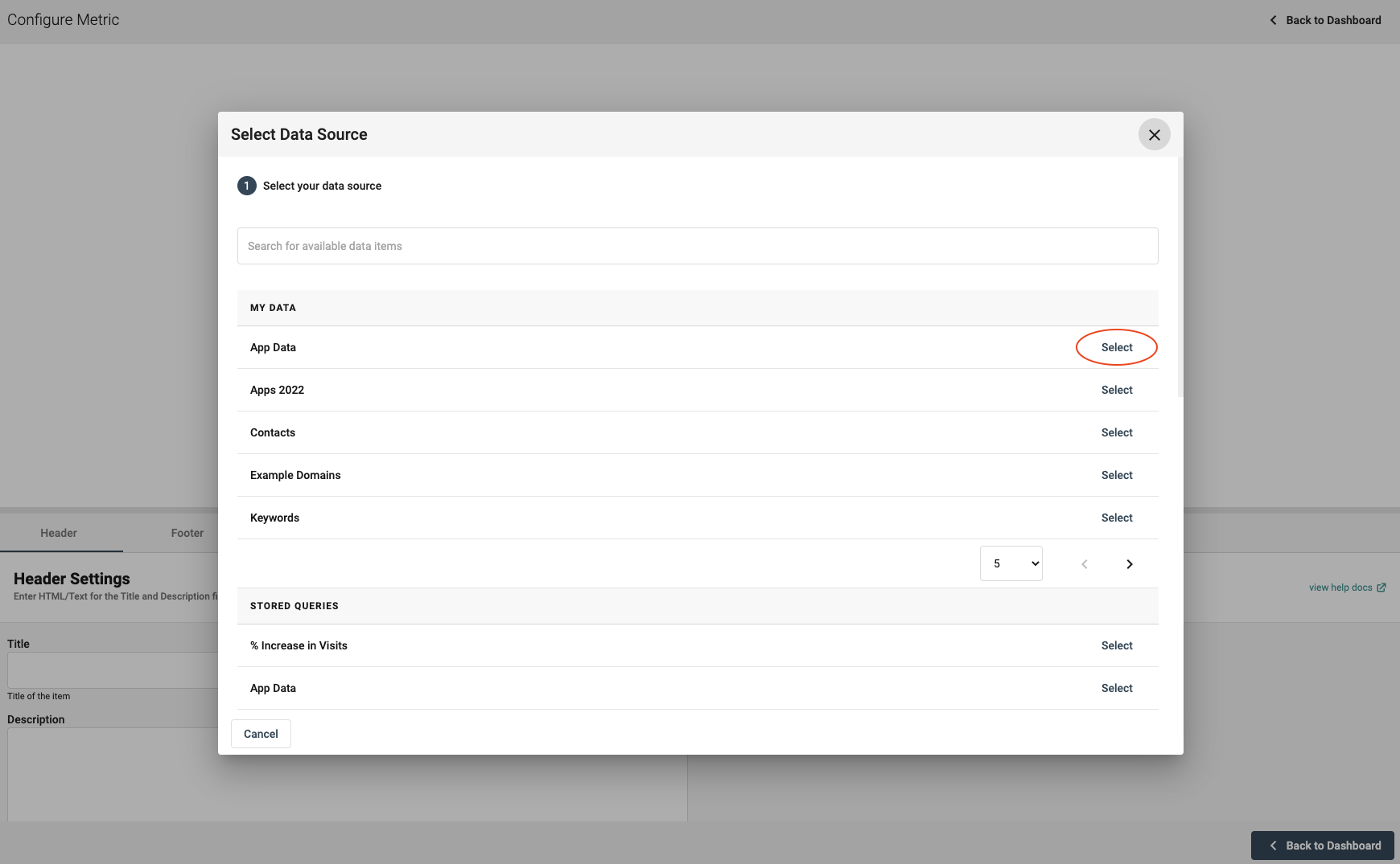 Select which data, stored query, data feed or snapshot you would like to create a Metric from.