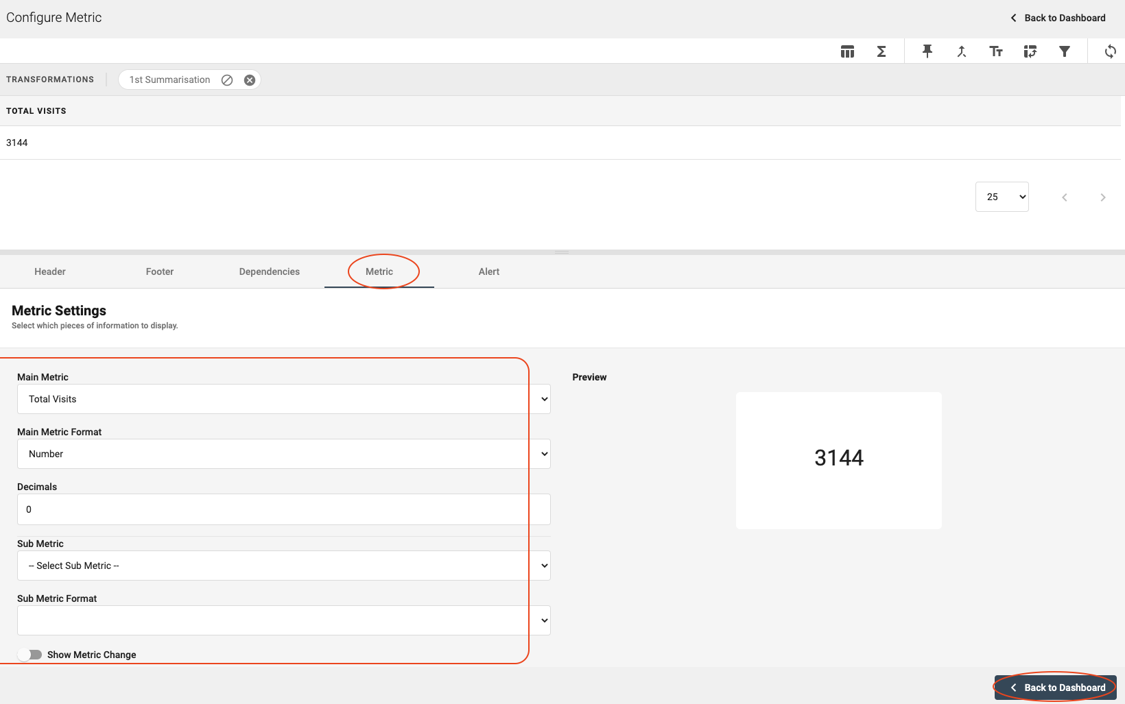 Now click on the 'Metric' section where you will be able to format your metric value and add a sub metric underneath if you wish to do so.