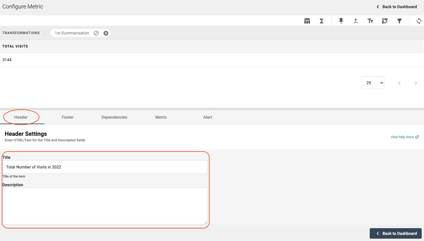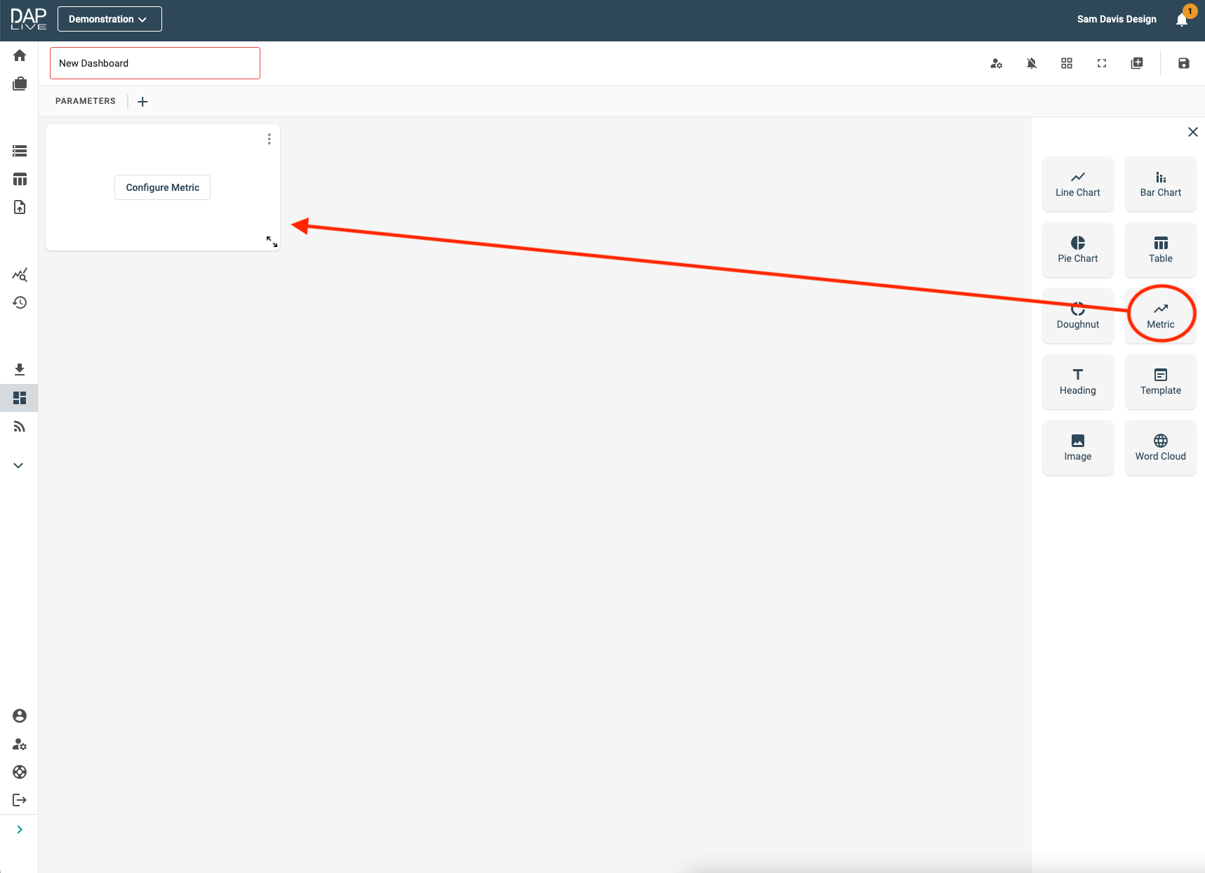 Give your dashboard a title and begin configuring by dragging and dropping the Metric icon onto the screen. Then click 'Configure Metric'.