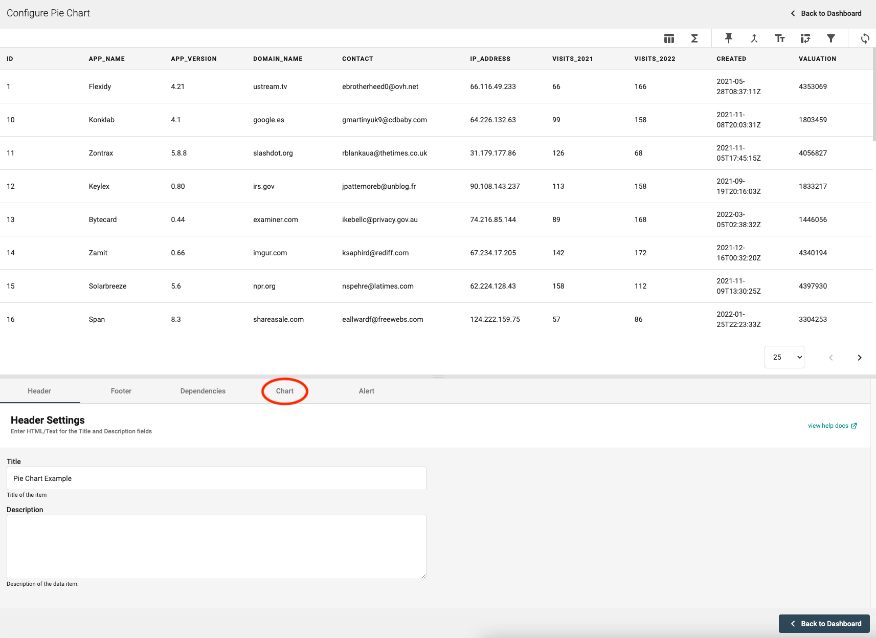 Name your Pie Chart under the 'Header' section and then click on the 'Charts' section. Here you will be able to select which columns of data you would like to set as your labels and values for each sector of your Pie Chart. If your data does not already contain numerical values that you want to be included in the Pie Chart, you can still use the tools on the top right-hand side of the page to join another query, add a formula or summarise the data.