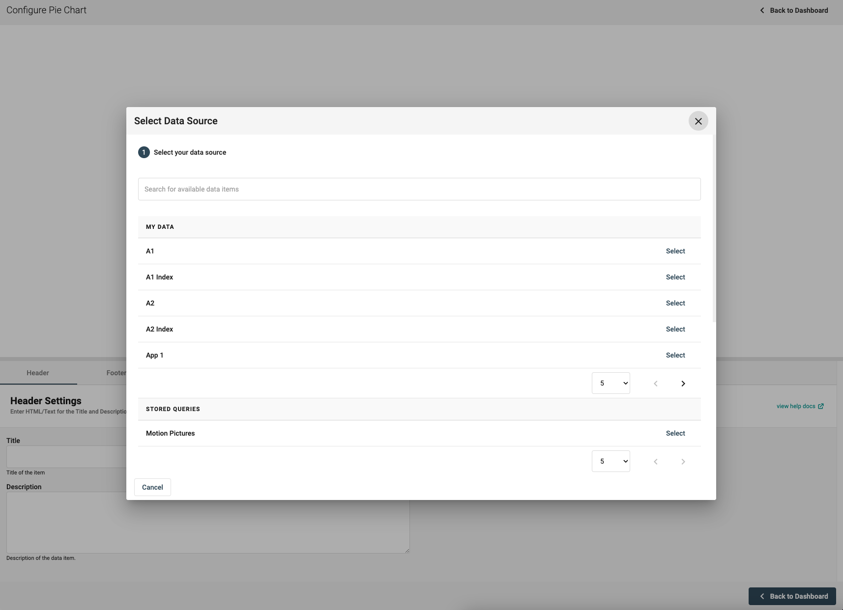 Select which data, stored query, data feed or snapshot you would like to create a Pie Chart from.