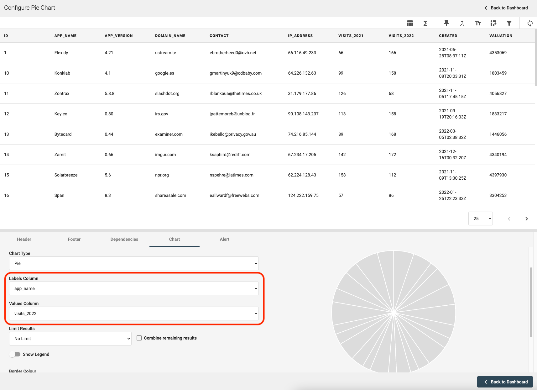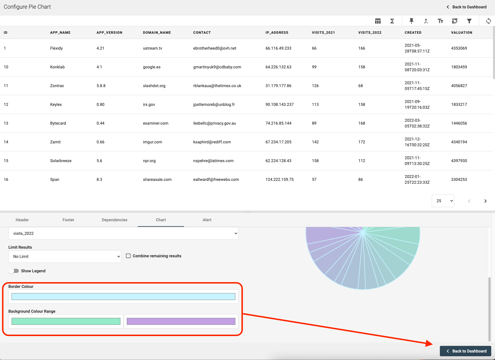 You can set various colour gradients for your Pie Chart and a preview of what your chart will look like is shown on the right. Once you are happy with your Pie Chart, simply click 'Back to Dashboard' in the bottom right-hand corner.