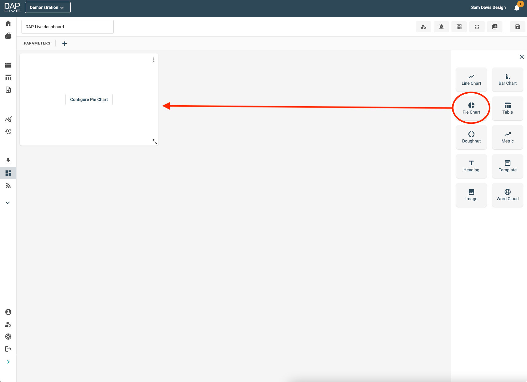 Give your dashboard a title and begin configuring by dragging and dropping the Pie Chart icon onto the screen. Then click 'Configure Pie Chart'.