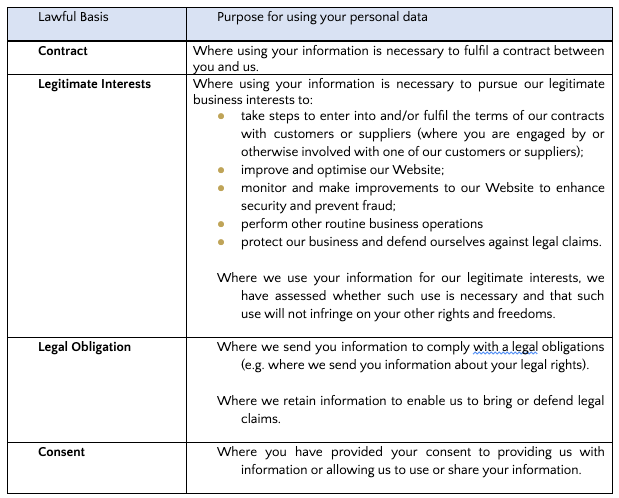 The following table sets out when we rely on each lawful basis.